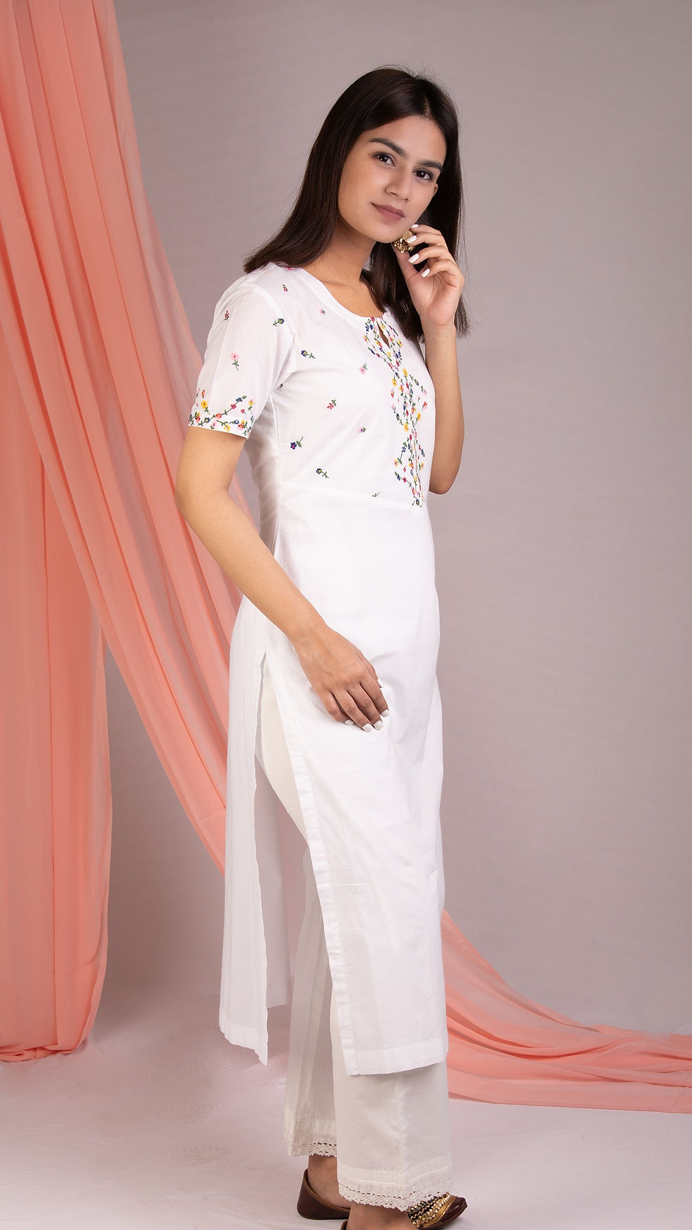 ONLY WHITES Georgette Kurta with Neck embroidery